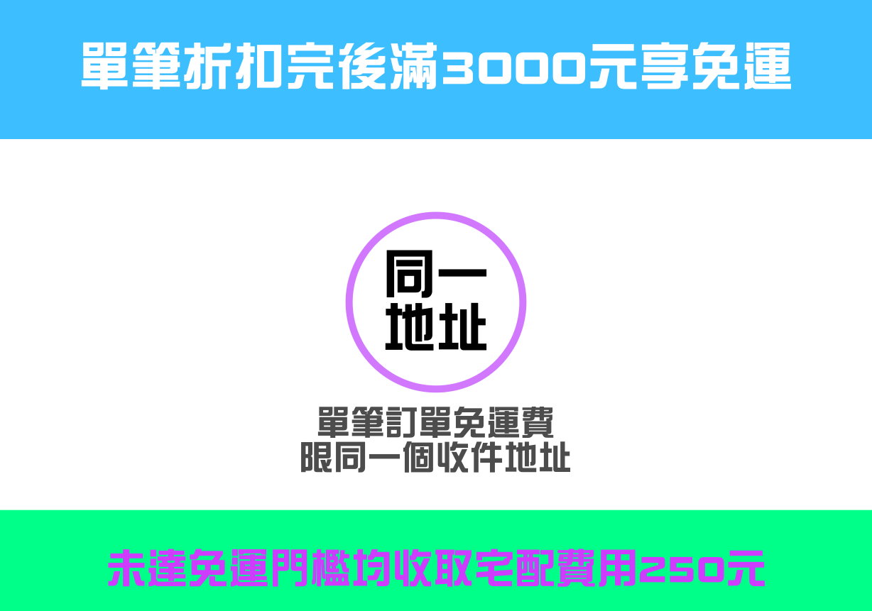 .全館單一折扣時,不限金額統一收取宅配運費$250元,若造成您的不便,敬請見諒。